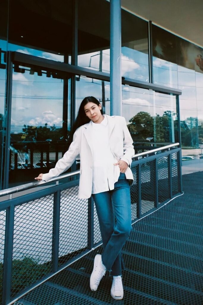 A pair of well-fitting jeans, a plain tee, and white sneakers create a stylish yet effortless look.
