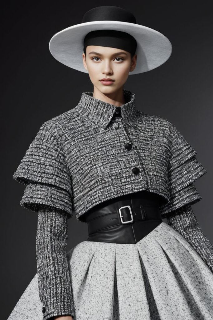 - Experimental textures: Crinkled fabrics, metallics, and vinyl materials.